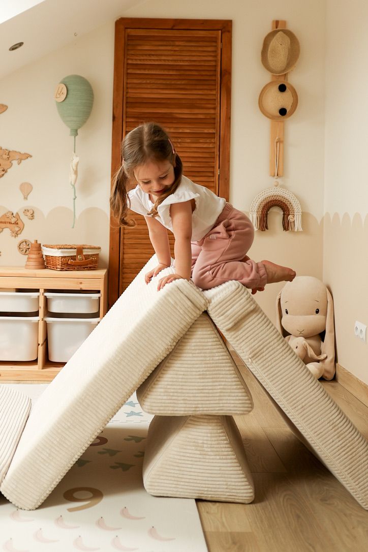 Les tout-petits explorent en rampant, apprivoisent l’équilibre et font leurs premiers pas en toute sécurité, gagnant en confiance et en coordination. Les plus grands, eux, se dépensent en sautant, grimpant et tenant l’équilibre sur leurs propres constructions.